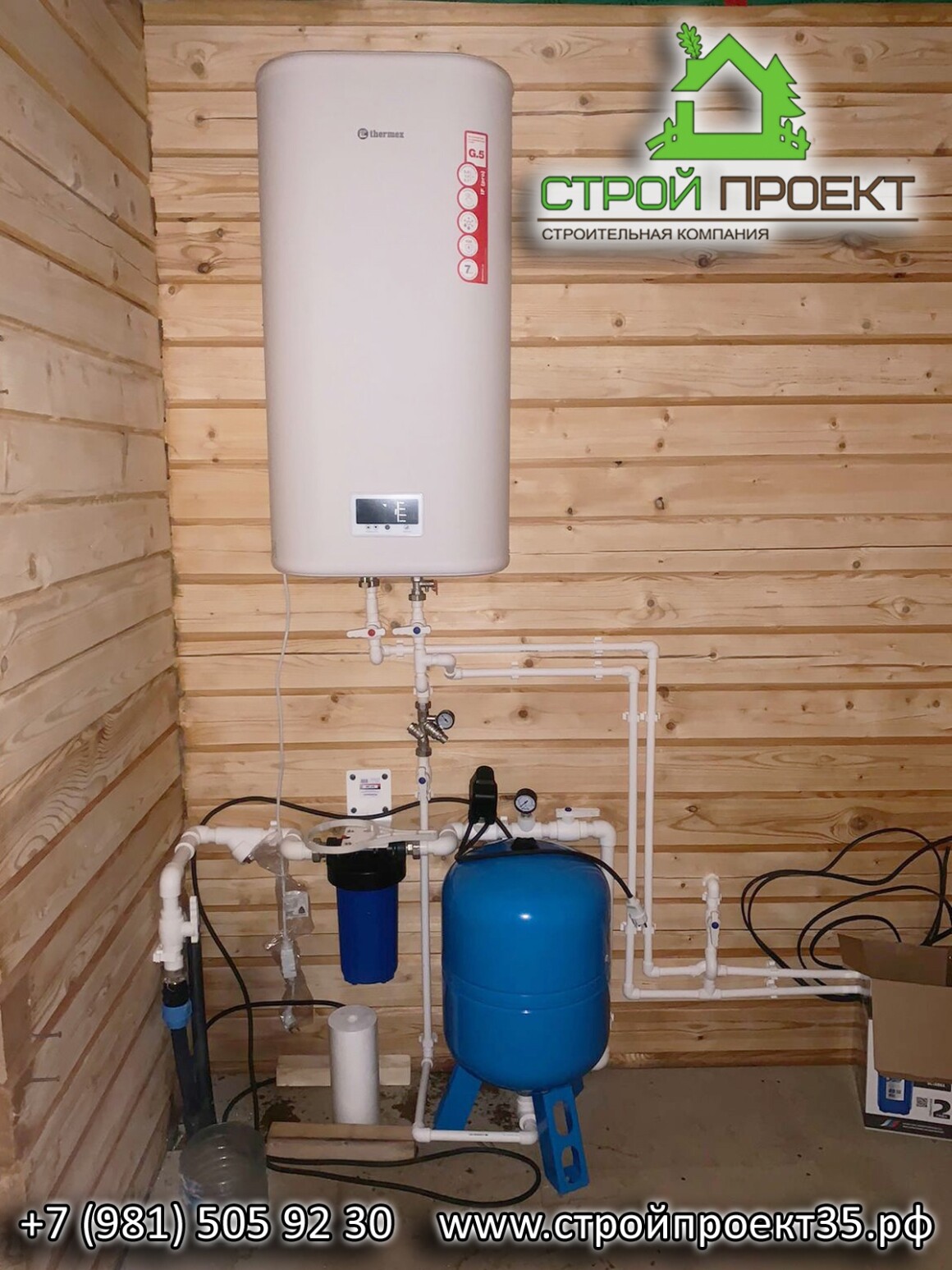Установили котел для горячего водоснабжения дома, выполнили работы по монтажу инженерных коммуникаций.