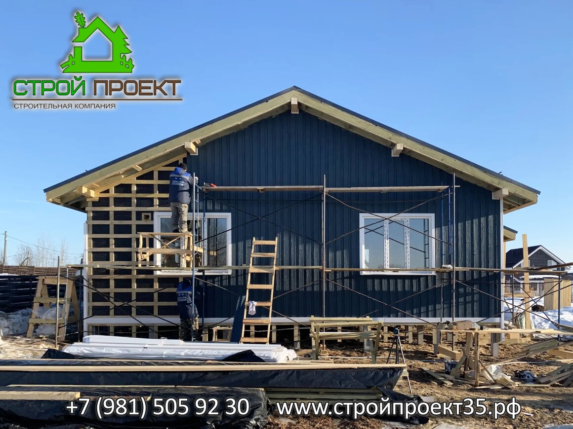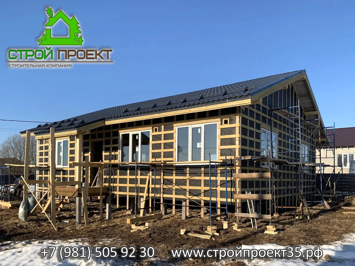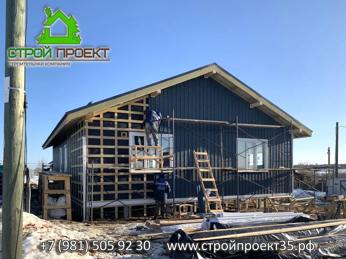 Работы по возведению каркасного дома 10,5х12,5 в п. Дубровское, Вологодского р-на в самом разгаре! На данный момент уже выполнили монтаж кровли, установили окна, утеплили стены, снаружи дом закрыли ветрозащитной мембраной с вентилируемым зазором, и сделали обрешетку для отделки фасада.